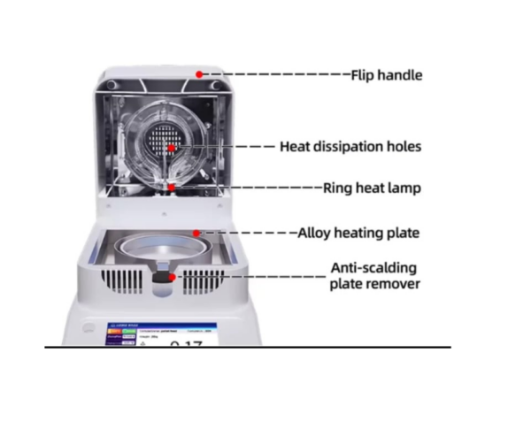 - Analizador de Humedad Gravimétrico de alta precisión, ideal para laboratorios, que funciona calentando una muestra con una lámpara halógena para determinar la pérdida de peso y calcular el porcentaje de humedad (0.01% a 100%)