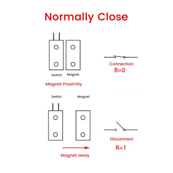 - El interruptor normalmente cerrado se cierra cuando no está cerca del imán; cuando el imán se acerca, se abre.